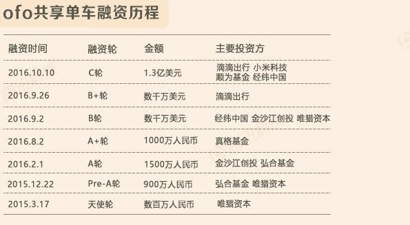 成立于2014年的共享單車ofo目前已經(jīng)完成了8輪融資,投資方達(dá)到十余家,包括滴滴出行、經(jīng)緯中國、小米科技、順為基金、真格基金等等。