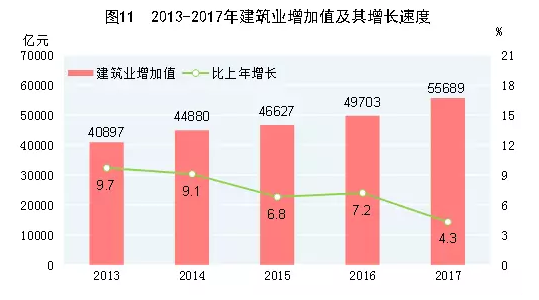 國家統(tǒng)計局2月28日發(fā)布了《2017年國民經(jīng)濟和社會發(fā)展統(tǒng)計公報》。數(shù)據(jù)顯示,2017年國內(nèi)生產(chǎn)總值827122億元,比上年增長6.9%,保持穩(wěn)定增速。其中建筑業(yè)總產(chǎn)值達213954億元,同比增長10.5%。但增加值55689億元,比上年增長4.3%,增長率較2016年有所下降。這也印證了基建通之前發(fā)布的預測:《市場不是永遠吃不飽的貪吃蛇:建筑業(yè)市場需求總量的臨界點正在到來,2018不會有更高的總量!》。