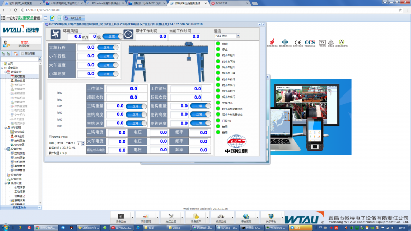 MGTZ70t地鐵門吊智能信息控制系統(tǒng),包含門吊數(shù)據(jù)監(jiān)控和視頻監(jiān)控兩部分。實現(xiàn)門吊使用過程中全方位的數(shù)據(jù)監(jiān)控和關(guān)鍵部位的視頻圖像監(jiān)控以及以上數(shù)據(jù)和圖像的存儲等功能。可實現(xiàn)遠程PC電腦實時遠程查詢監(jiān)控,數(shù)據(jù)回放、曲線擬合等功能;可實現(xiàn)手機APP遠程實時查詢設(shè)備狀態(tài),數(shù)據(jù)抽取查詢等功能。