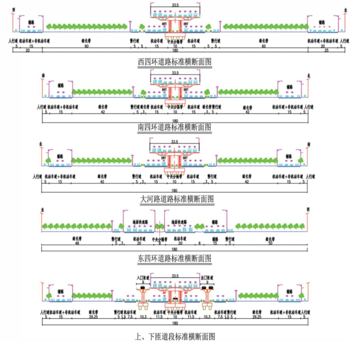 以兩條典型環(huán)線為例,大河路道路標準橫斷面設計如下,高架橋寬度為33.5米,雙向八車道。高架橋下方設置10米的中央分隔帶,分隔帶兩側各有4個機動車道,其中最內側機動車道將被設置為BRT車道。機動車道外側是5米的慢車道,慢車道和機動車道間有3米的隔離帶。慢車道外側,是42米寬的綠化帶,綠化帶外側是輔路,輔路將被設置為機動車道和非機動車道的混合車道。而最外側,將是5米的人行通道。