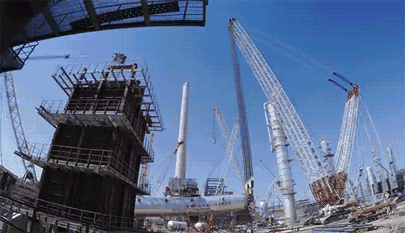▲中聯(lián)重科3200噸履帶吊正在吊裝凈重1308噸的反應(yīng)器