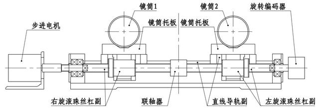 為了增加雙鏡筒測頭的測量范圍,實(shí)現(xiàn)測量范圍的自動調(diào)節(jié),我們在雙鏡筒測頭基礎(chǔ)上又增加了一套間距自動調(diào)整裝置。該裝置主要由鏡筒托板、直線導(dǎo)軌、精密滾珠絲杠、步進(jìn)電機(jī)和旋轉(zhuǎn)編碼器組成。