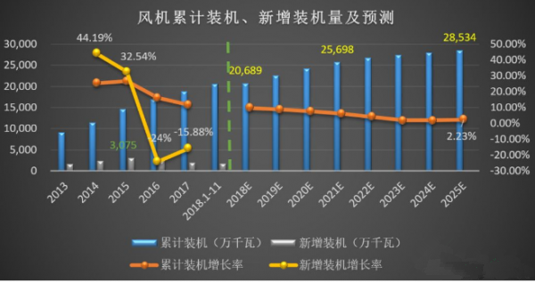2016年11月29日,國(guó)家能源局印發(fā)《風(fēng)電發(fā)展“十三五”規(guī)劃》,根據(jù)規(guī)劃提出總量目標(biāo),到2020年底,風(fēng)電累計(jì)并網(wǎng)裝機(jī)容量確保達(dá)到2.1億千瓦以上,下圖為2013年至2018年1-11月各年新增裝機(jī)、累計(jì)裝機(jī)容量和各自增長(zhǎng)率變化數(shù)據(jù),以及通過(guò)未來(lái)經(jīng)濟(jì)增長(zhǎng)率、可再生能源總裝機(jī)、風(fēng)電總裝機(jī)等推算預(yù)測(cè)出2018至2025年風(fēng)電累計(jì)裝機(jī)容量以及其增長(zhǎng)率。