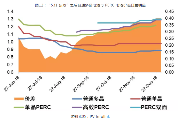 目前普通單多晶電池價差很小,而高效 PERC電池較普通多晶有 0.3 元/W 左右的溢價,溢價幅度超過 30%,而成本端的差異不超過 0.1 元/W,因此高效單晶電池的超額利潤非常豐厚。如果按照多晶硅片 2.05-2.1 元/片的售價,每片功率 4.67W,非硅成本 0.3-0.4 元/W 測算,普通多晶電池的毛利率位于 0-10%之間,高效單晶電池的利潤率則高達(dá) 25%以上,即使考慮 2019 年大量單晶 PERC 電池產(chǎn)能投放,高效 PERC 與普通多晶電池的價差收窄至 0.2 元/W,在多晶的盈虧平衡線上,PERC 電池仍有 0.2 元/W 左右的毛利潤。因此,在普通多晶電池徹底退出市場之前,高效 PERC 電池將始終享有明顯的超額收益。