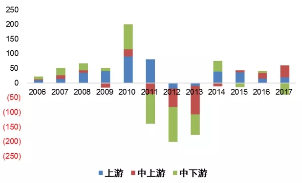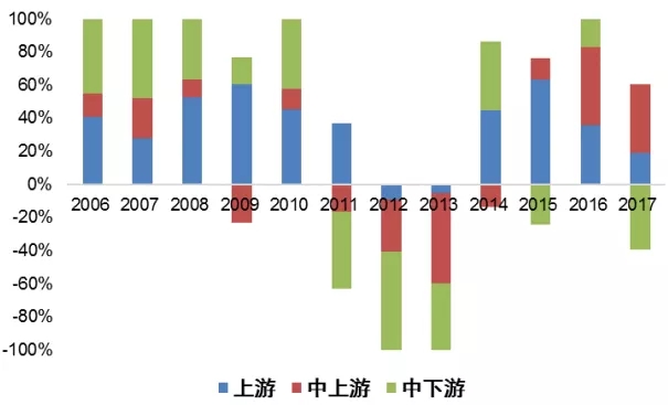 上圖可以看出近12年來上游產(chǎn)品占比較大,除2011-2013年以外受宏觀調(diào)控影響較大外,規(guī)模和份額比較穩(wěn)定,中游、下游發(fā)展較為波動。行業(yè)總體盈利情況取決于行業(yè)景氣度,而產(chǎn)能周期是利潤分配的主要決定因素。從行業(yè)總體盈利上看,2006-2010 年上述企業(yè)的利潤總額從 14億元增長到 150 億元,2009 年金融危機(jī)的沖擊并未改變行業(yè)總體向上的大趨勢。2011-2013 年政策調(diào)整導(dǎo)致全行業(yè)陷入虧損,2014 年以后企業(yè)盈利開始緩慢修復(fù),但盈利能力距離 2011 年的高位相距甚遠(yuǎn)。
