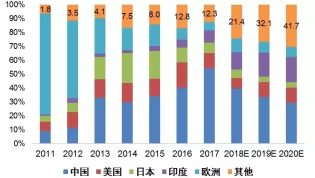一直以來,中國、美國、日本、印度和歐洲五大市場幾乎占據(jù)了全球新增裝機(jī)總量的 90%,2017年五大市場的裝機(jī)容量超過 80GW。根據(jù)數(shù)據(jù)咨詢機(jī)構(gòu)的統(tǒng)計和預(yù)測,五大市場的裝機(jī)量在未來三年仍將保持平穩(wěn)上升趨勢,新興市場則將加速崛起,成為全球裝機(jī)量增長的主要來源。