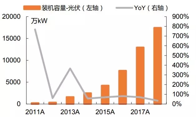 從補(bǔ)貼角度來看,2018年我國分布式補(bǔ)貼標(biāo)準(zhǔn)僅下降0.05元/KWh,而組件成本小浮下降即可可覆蓋分布式電站運(yùn)營損失。對于分布式光伏扶貧電站以及村級扶貧電站的補(bǔ)貼仍然維持不變。預(yù)計在光伏扶貧、分布式等的拉動下,我國2018年光伏裝機(jī)量仍有保障。隨著光伏發(fā)電系統(tǒng)成本的不斷下降,光伏發(fā)電有望在2020年左右迎來平價上網(wǎng)時代,我國光伏裝機(jī)市場有望取得持續(xù)的快速發(fā)展。而從國外市場來看,印度市場在2017年光伏新增裝機(jī)達(dá)到9GW,連續(xù)三年實現(xiàn)光伏新增裝機(jī)的翻倍增長,但從累計裝機(jī)量來看,仍然只有20GW左右,距離印度提出的到2022年累計裝機(jī)100GW的目標(biāo),仍有很大的發(fā)展空間。在目前的系統(tǒng)成本下,部分光照條件較好的新興地區(qū)光伏發(fā)電經(jīng)濟(jì)性已超過傳統(tǒng)燃煤發(fā)電。平價上網(wǎng)時代的來臨,全球光伏裝機(jī)將持續(xù)保持高速增長。光伏用硅需求將成為拉動工業(yè)硅消費(fèi)增長的主要動力之一。