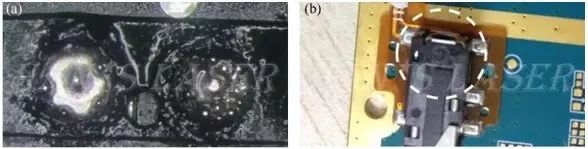 主要應(yīng)用領(lǐng)域有PCB電路板、光學(xué)元器件、聲學(xué)元器件、半導(dǎo)體制冷元器件及其他電子元器件錫焊。圖1為激光送絲錫焊產(chǎn)品圖,可以看到,焊點(diǎn)飽滿,與焊盤潤濕性好。