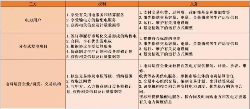 此外,三方協(xié)議及交易平臺同樣是分布式發(fā)電市場化交易中的要點。三方協(xié)議需購電方(電力用戶)、發(fā)電方(分布式發(fā)電項目)、輸電方(電網(wǎng)運營企業(yè))共同明確易模式、交易電量、交易期限,交易價格、計量、結(jié)算,以及三方權(quán)利與義務(wù)等內(nèi)容。三方具體權(quán)利及義務(wù)如下表所示: