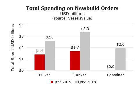 與2018年同期相比,2019年第二季度所有船型的新造船市場大幅放緩,油船訂單同比減少一半,集裝箱船訂單受貿(mào)易戰(zhàn)影響最大。