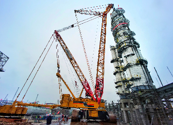 圖為,石化起運(yùn)公司XGC28000型2000噸履帶式起重機(jī)正在浙江石化裝置區(qū)進(jìn)行常減壓大型塔吊裝。