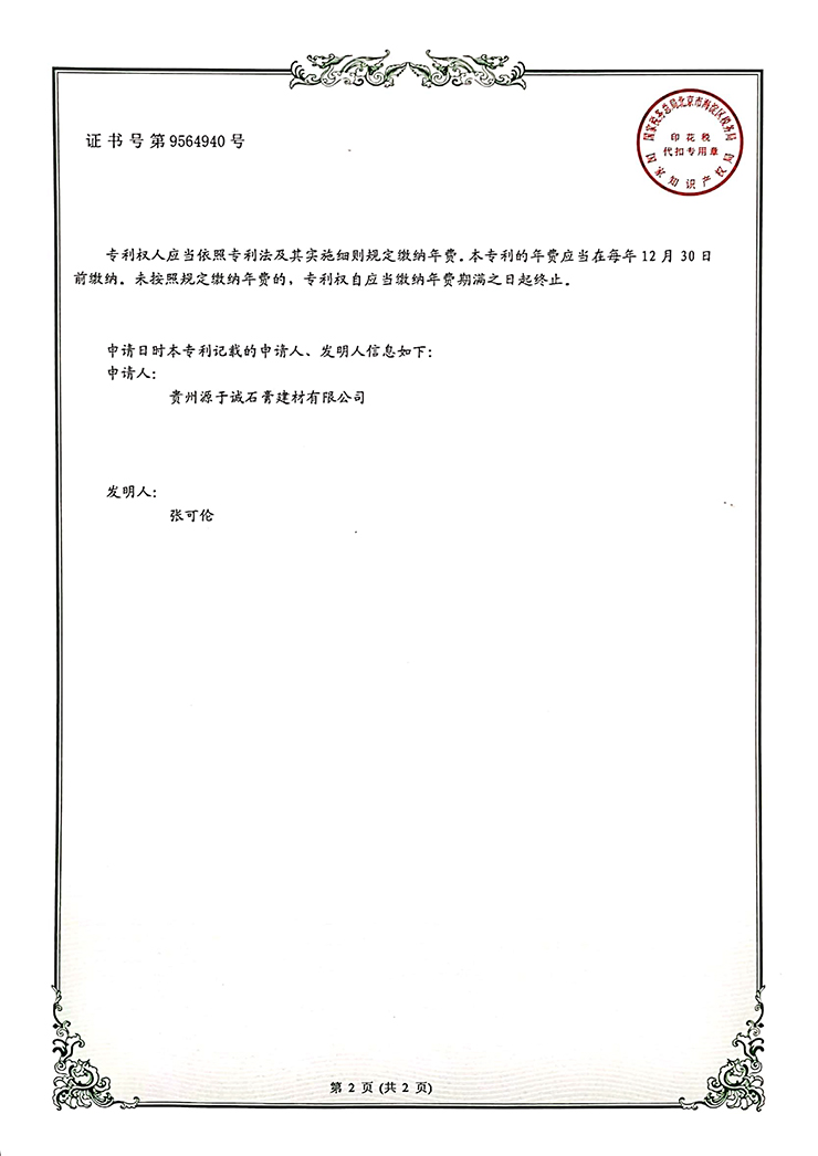 專(zhuān)利證書(shū)(一種多功能紙面石膏板生產(chǎn)裝置)